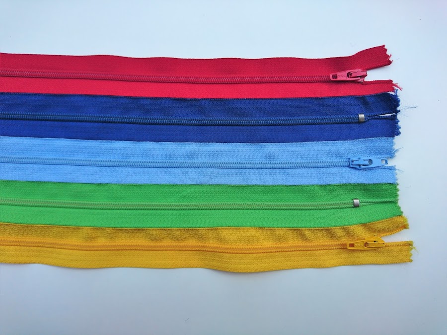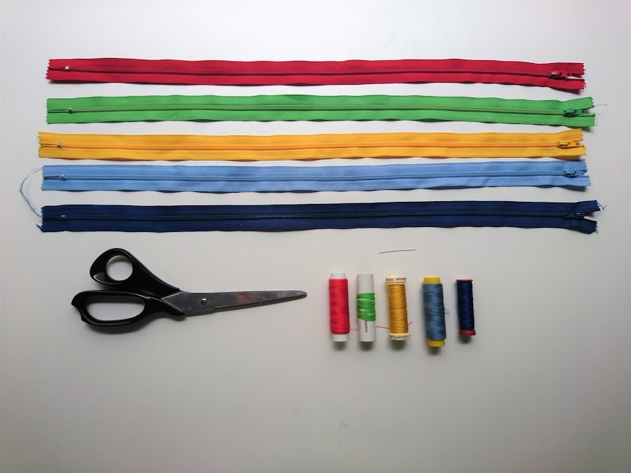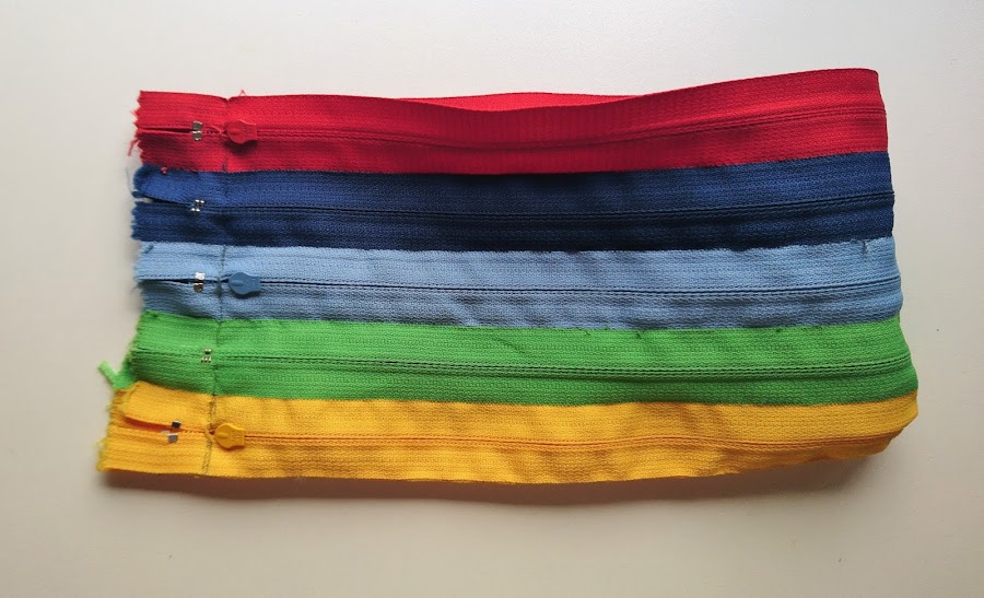 Para empezar colocamos las cremalleras en la escala de color que más nos guste, os recomiendo que sean colores llamativos y evitemos el blanco, pues se ensucia con mucha facilidad. En mi caso las coloqué en orden cromático, para que se asemejara un poco al arcoiris. Las cremalleras las puse alternadas, es decir, el carril para un lado y en la siguiente al lado contrario.