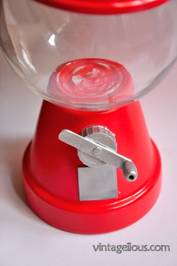 Los materiales usados para el modelo rojo son: una maceta de barro con su plato, un tirador que reutilizamos (también podría ser una bolita de madera por ejemplo), una pecera, el envase y el tapón de un brick, un palo de helado, y como manivela una pequeña bolita de madera o algo parecido, pegamento y pintura en spray.