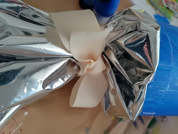 Una vez seco, metes el regalo y con celo unes el papel plateado con el culo de la botella. Al papel le das forma de cola de pez y lo cierras con la cinta o el lazo.