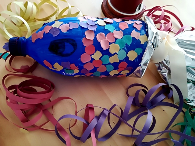 El material es muy simple, una botella de plástico, pintura acrílica de color azul, papel de regalo plateado o de un color llamativo, celo, una cinta o lazo, pegamento, un pincel, confeti y rotuladores negro y blanco (o pintura)
