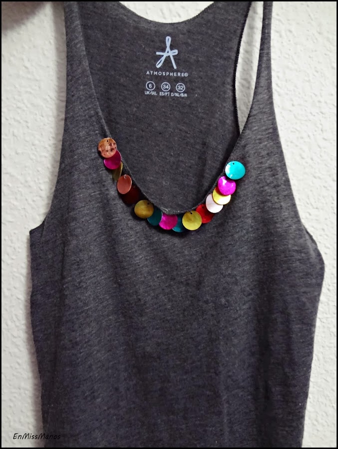 Era una camiseta lisa de tirantes que me compré en verano para hacerle algo, pero no se me ocurría nada y al final la acabé usando así.