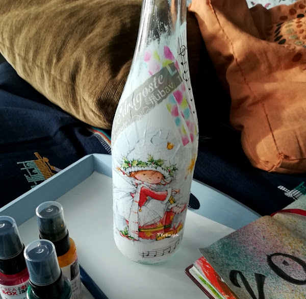 En este caso, una vez tengo la botella limpia y sin etiqueta, le he dado una capa de gesso. Cuando se ha secado, he trabajado el decoupage con unos papeles y una servilleta con motivos navideños. Ya sabes, una mezcla de agua y cola blanca para trabajar el decoupage y separar las 3 hojas de la servilleta. Rápido y con un resultado super bonito.