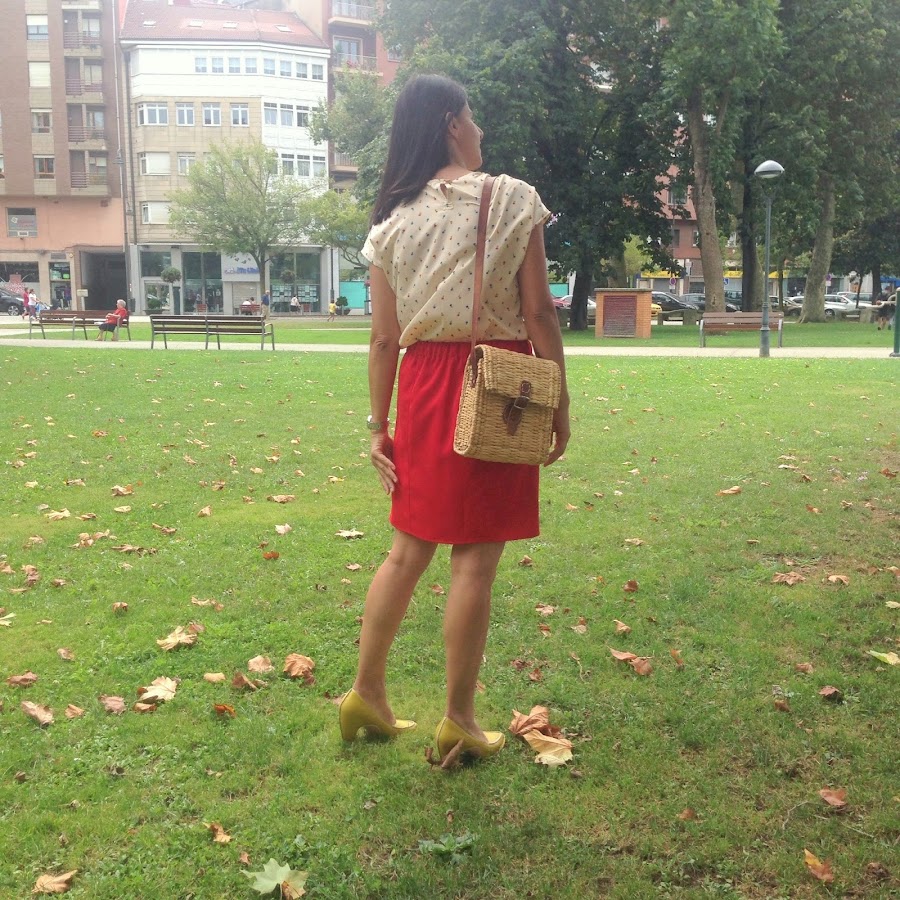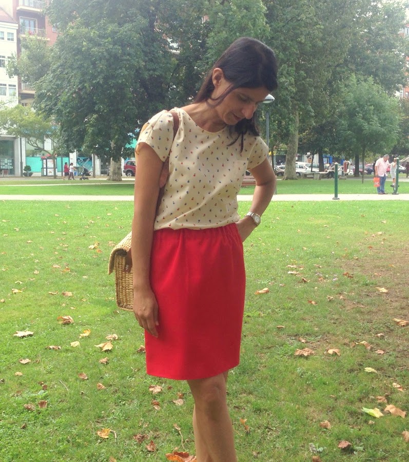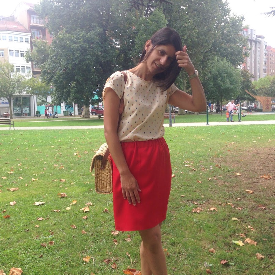 Se trata de la falda más fácil de coser de todo el mundo mundial. Para completar el look totalmente VINTAGE con la blusa de tela de La Revoltosa, le cosí una falda un retalín de tela roja que me cedió mi madre de vete tú a saber cuantos años lleva en el armario.