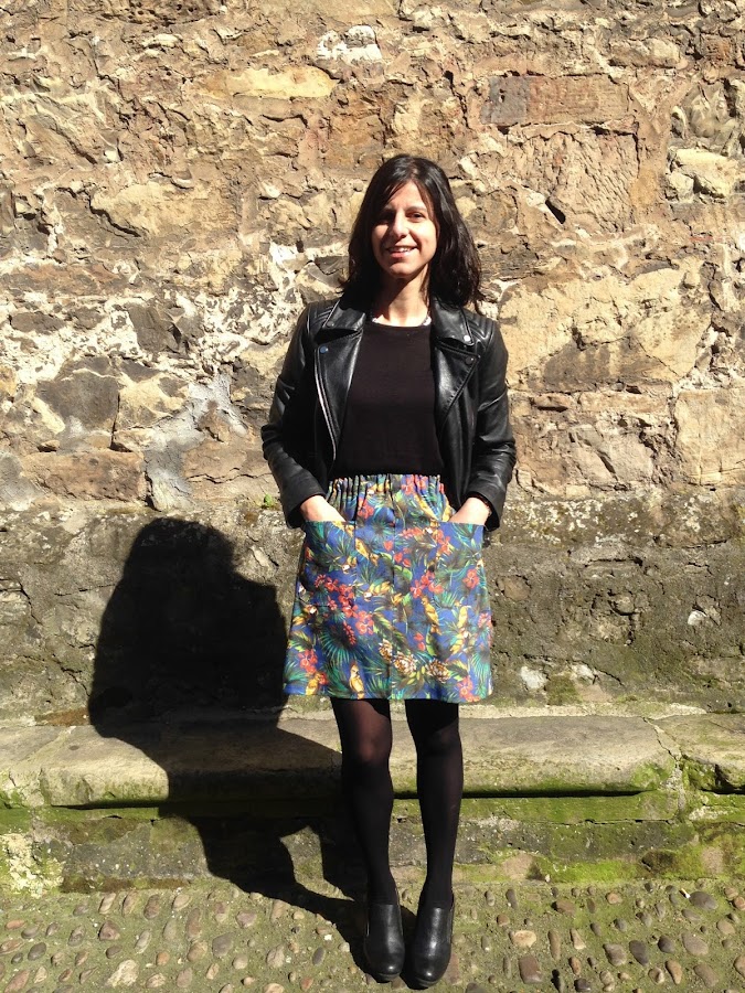 Para coser la falda he cortado cuatro rectángulos de 28x57, para las cuatro piezas que componen la falda. He cosido las cuatro partes unas a otras y les he cargado la costura para que asentasen mejor. Le he puesto dos bolsos tipo plastón en el frente. Y para finalizar, le he cosido un dobladillo hacia el interior en la parte de la cintura pasa pasar el elástico. Es tan sencillo como medir tu contorno de cintura y de cadera y darle más o menos ancho de tela según el frunce que te guste.