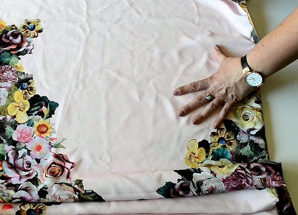 - Tela elegída, yo os recomiendo para este tipo de falda un mikado de seda o similar. La tela que yo elegí tiene más caída, pero aun así tiene cuerpo y con el tipo de estampado quería hacerla así. Con un mikado de seda con menos cantidad de tela del ancho tenemos suficiente pues queda más tiesa y con más cuerpo. Necesitamos dos largos de la falda, pues utilizaremos todo el ancho para cada parte, delantero y espalda. en mi caso he realizado la falda de 60 cm largo, necesito en tela 1,40 m.