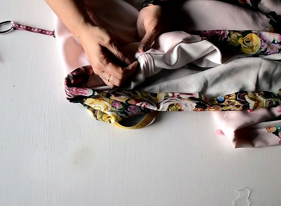 Para terminar la falda cosemos el bajo al largo deseado, yo la he cosido a 60 cm, medimos bien para que quede al mismo largo por toda la falda y cogemos con alfileres. Planchamos para fijar más el dobladillo y cosemos con puntado invisible a mano para que quede más fina.