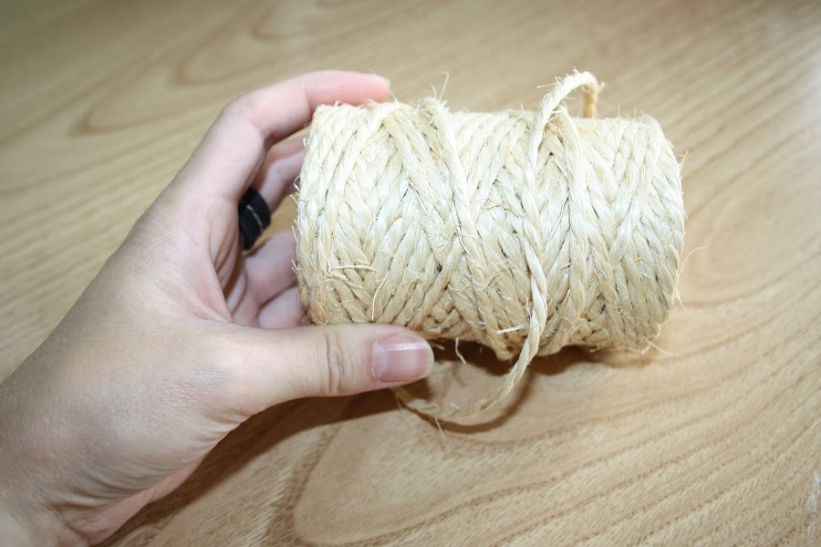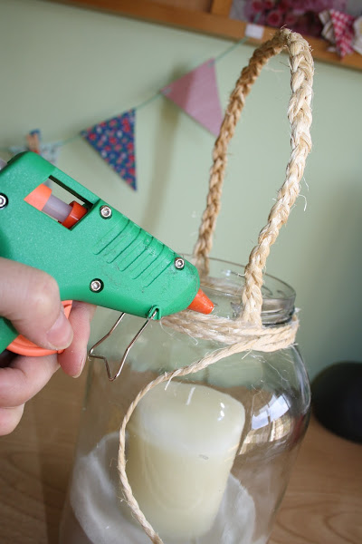 Una vez pegada el asa, con la pistola de silicona pegaremos cuerda para tapar lo que acabamos de pegar.