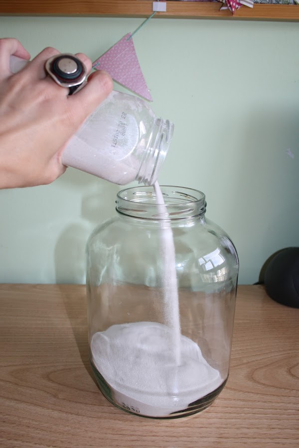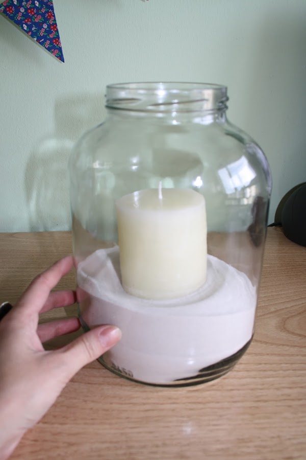 Después hay que echar la arena dentro del recipiente de vidrio y poner dentro la vela. Tened en cuenta que hay que medir el diámetro de la misma para asegurarnos que entre dentro.