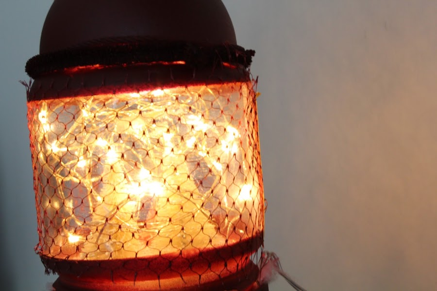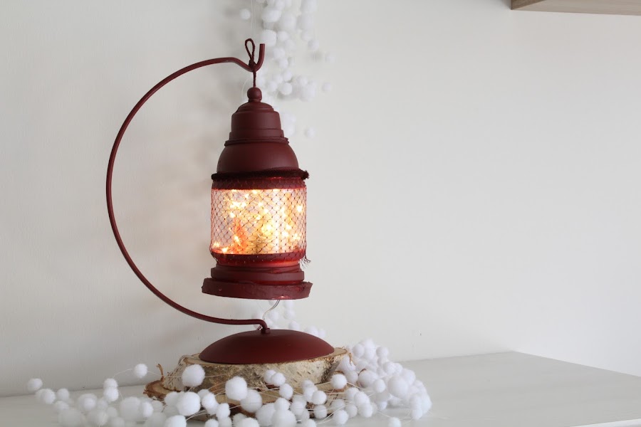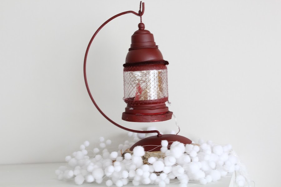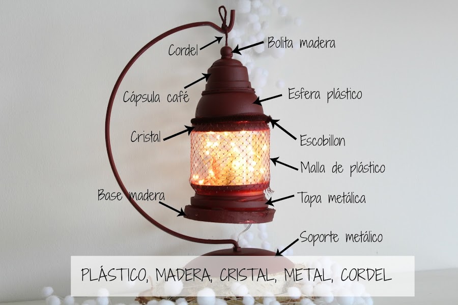 Para el soporte del farolillo pinte un soporte metálico que se vende para colgar bolas de navidad. Ahora solo quedara poner las luces en el interior de nuestro farolillo y a brillar esta navidad.