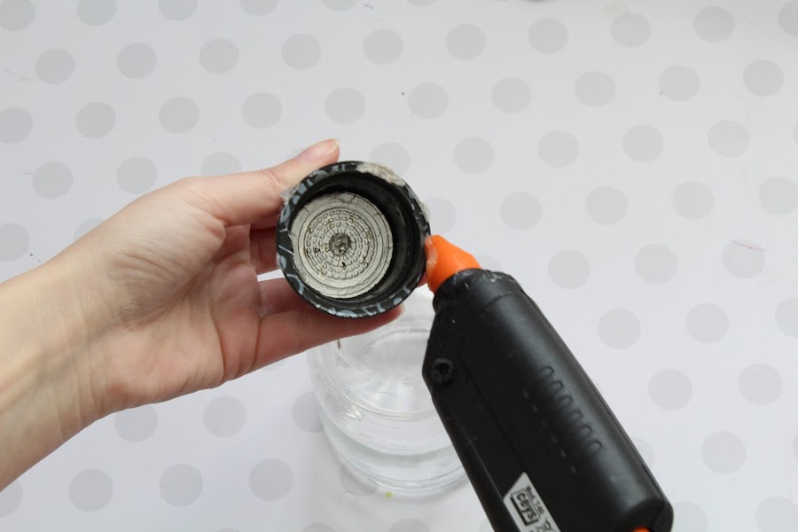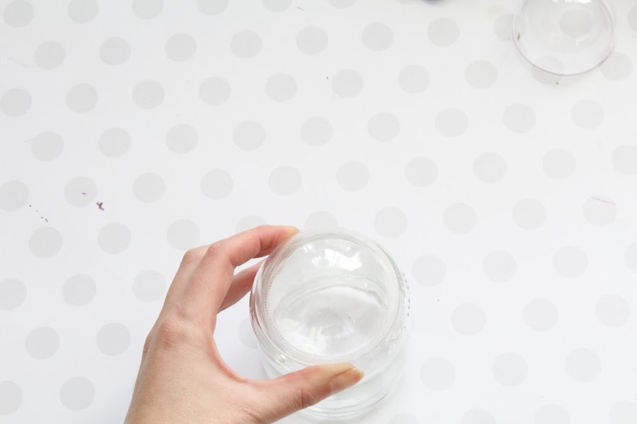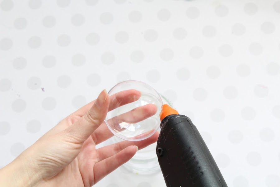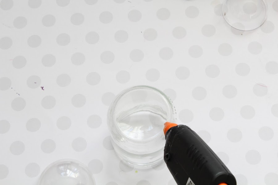 Para la segunda parte pegaremos con silicona caliente, en la parte de abajo del bote de cristal, una mitad de una esfera de metacrilato.