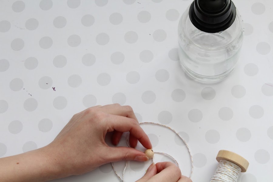 Para poder colgar nuestro farolillo le haremos un colgador, usando una bolita de madera con un orificio en medio y pasando un cordel.