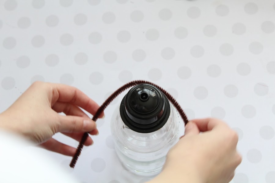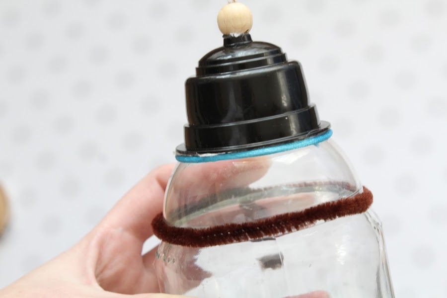 2 Paso: Para cubrir los posibles pegotes de silicona, ataremos un cordel y un escobillon alrededor de las dos esferas.