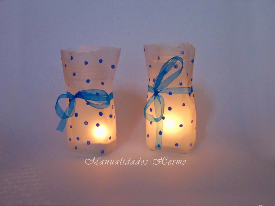 Materiales: Tarros de cristal, papel vitela también se le llama vegetal o de cebolla, pintura acrílica, pincel, silicona, tijeras de corte ondulado ( opcional), lazo, tijeras, dos velas, y un bastoncito.