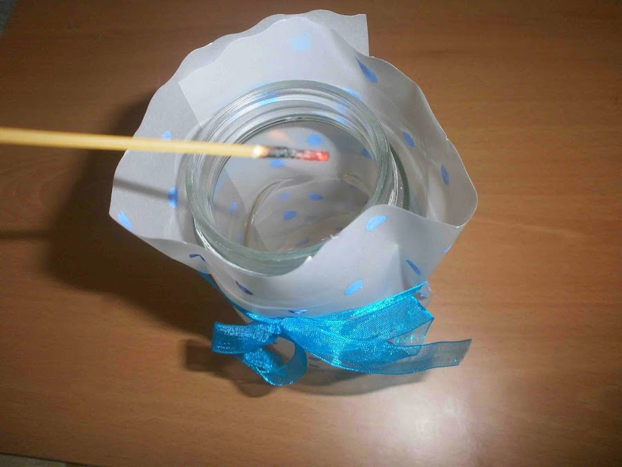 Le puse la vela dentro del tarro y lo adorne con un lazo.