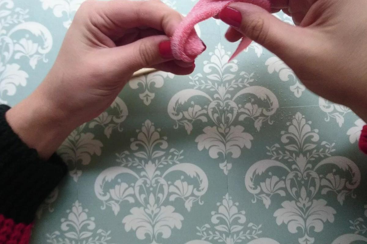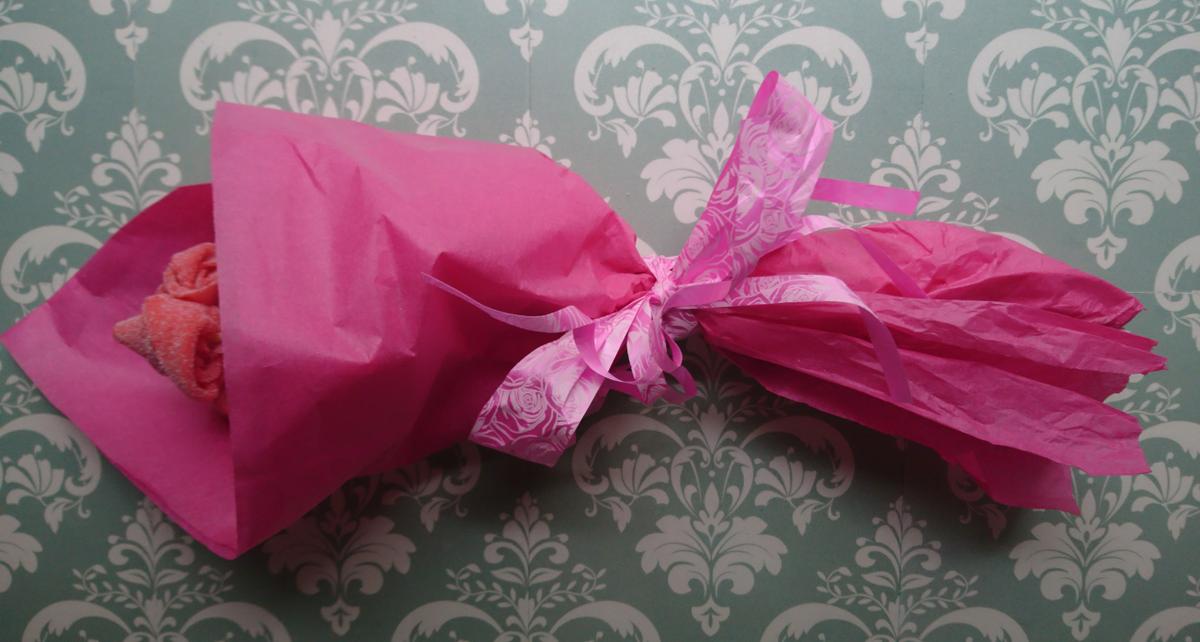 Ahora pasamos a hacer el ramo, para ello tenemos que colocar las rosas juntas en una de las esquinas de la lámina de papel de seda o pinocho y lo envolvemos, de manera que nos quede el pico por la parte de atrás del ramo. Para dar el toque final, haremos un bonito lazo con la cinta y ya estaría listo para que se lo entreguemos al afortunado o afortunada que reciba este regalo tan dulce.