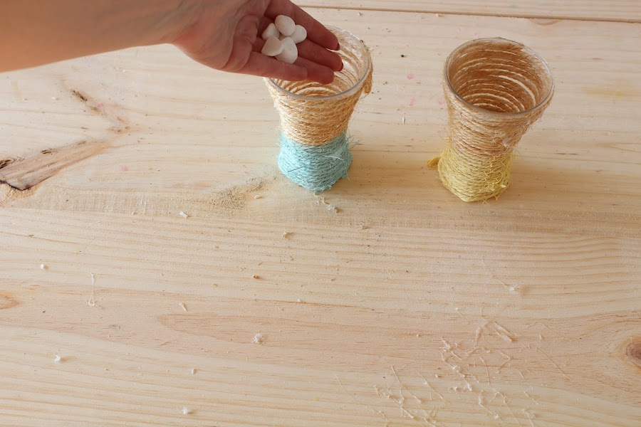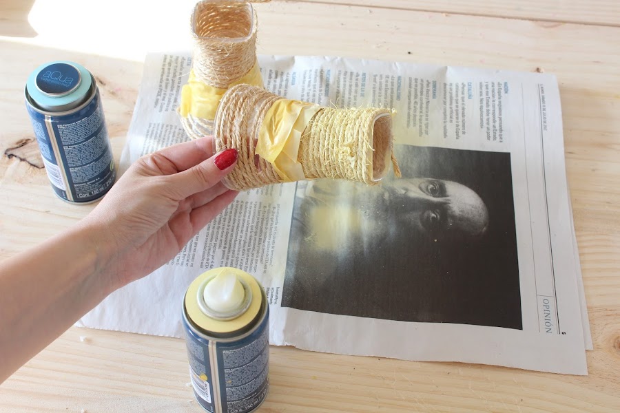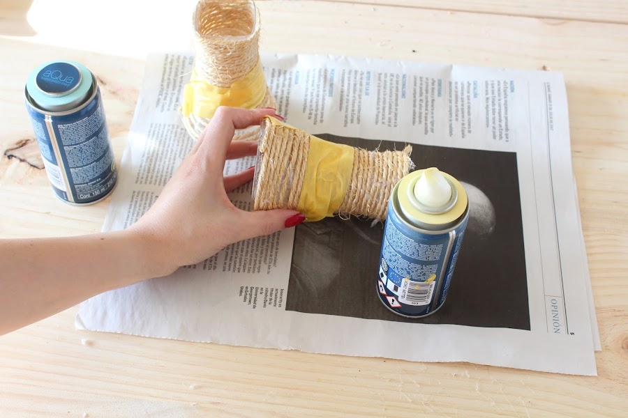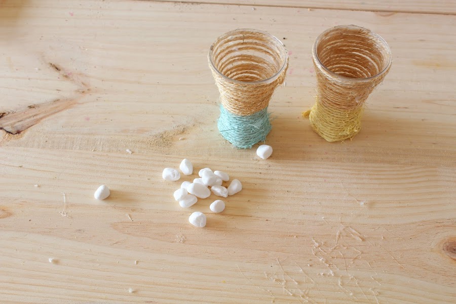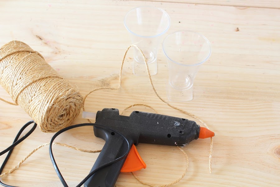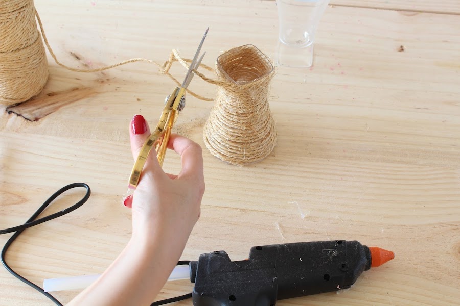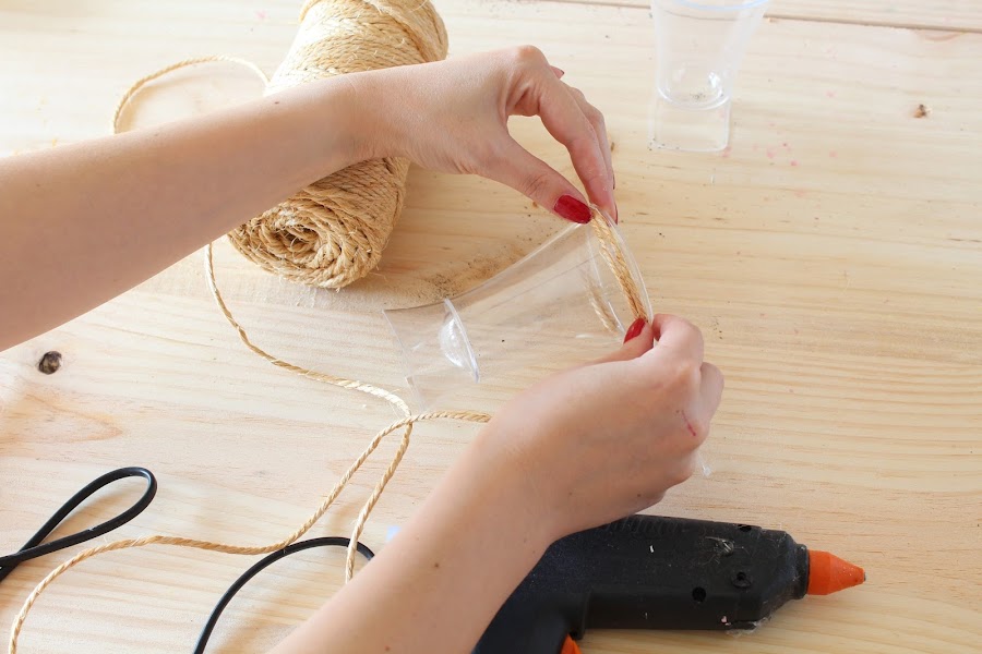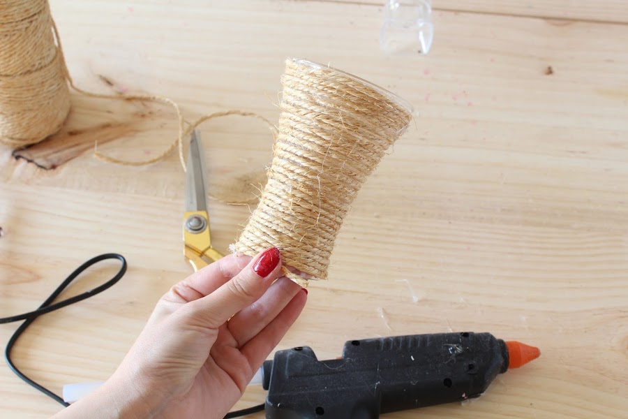 1 Paso: Forraremos el envase de helado con cuerda, para ello usaremos la pistola de silicona.