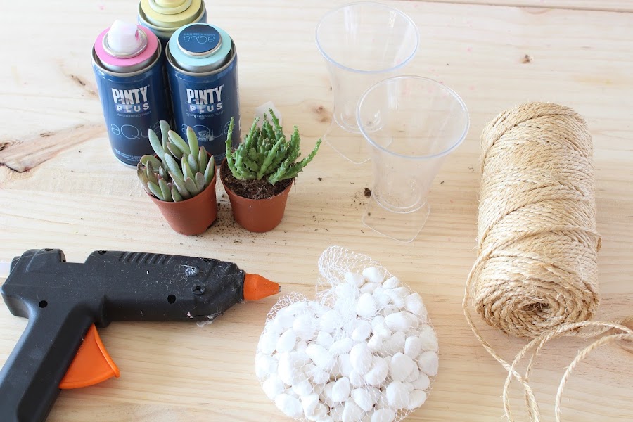 3 Paso: Ponemos piedras en el fondo de los envases y luego plantamos nuestros mini cactus.