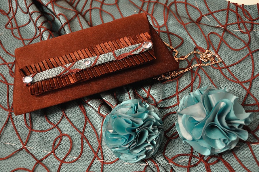 Y de paso reutilicé un bolso que ya tenía, quitamos los adornos que traía que iban a juego con otro vestido y se le añadió una tira de la tela del vestido pegando con una pistola térmica, también podemos usar pegamento para telas. Y por ultimo aplicamos unas piedras de color celeste.