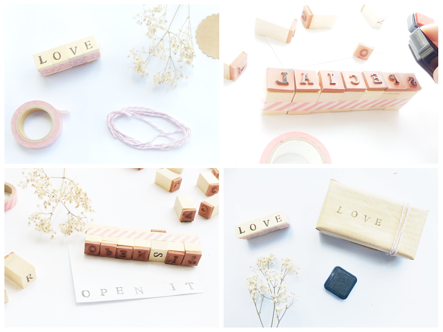 Por eso hoy vamos a aprender una tontería de truco que te hará más fácil usar estos sellos. Lo único que hará falta es: un pack de sellos de letras (el mío es de tiger) y un poco de washi. Y luego la superficie sobre la que queráis poner la frase, como una blonda de craft, un paquetito de regalo o un sobre. Si quieres también puedes utilizar otros materiales para decorar como el cordón de bakers twine, pincitas de madera o pegatinas varias.