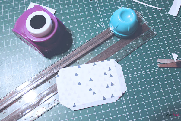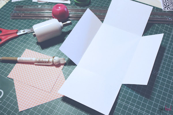Ahora llega el turno de hacer los bolsillitos donde colocar todos los detalles que vamos a incluir en este bonito correo. Son muy sencillos de hacer, un rectángulo, le cortamos las esquinas y hacemos los dobleces. Yo lo he ido pegando todo con cinta de doble cara y ha resistido muy bien.