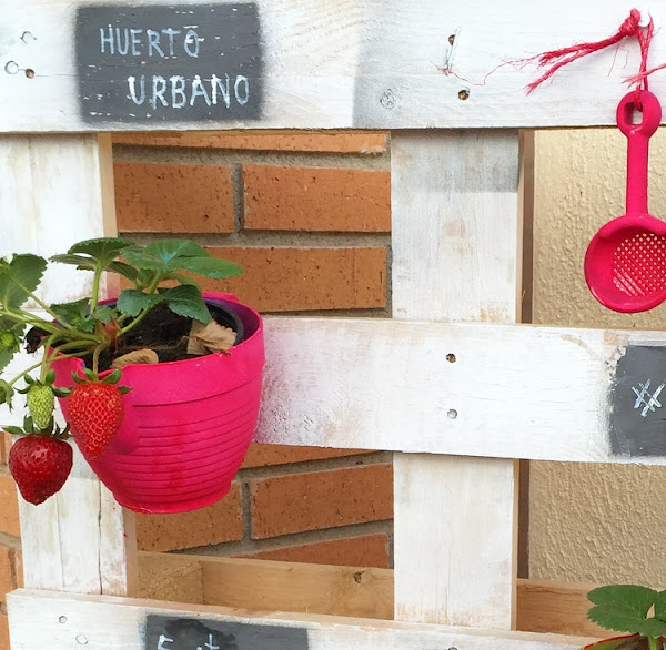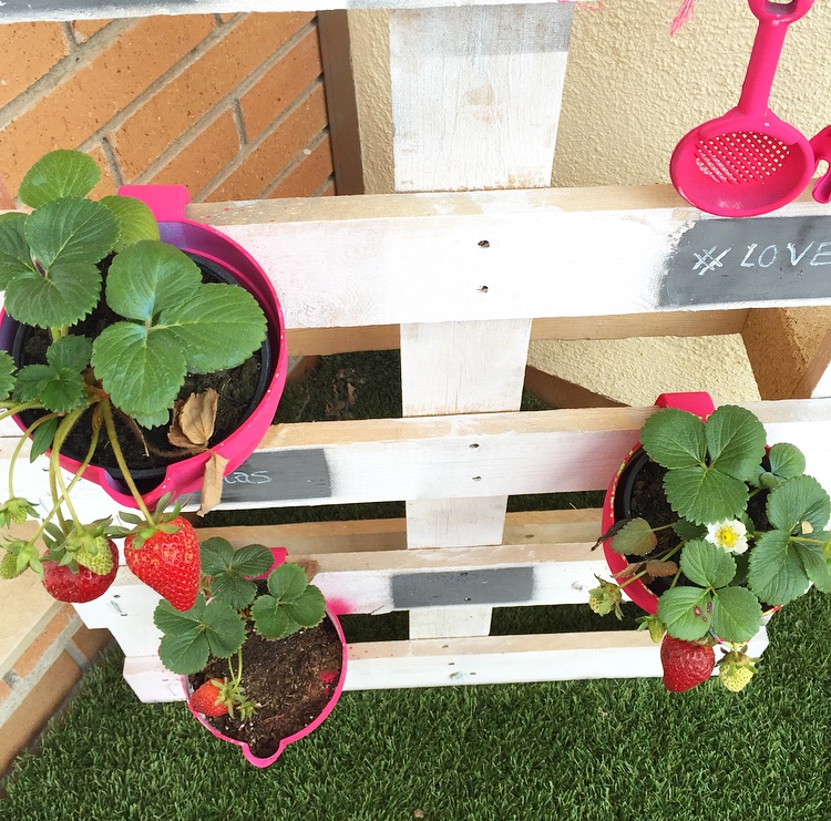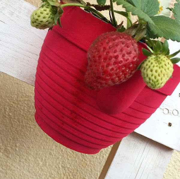 Pintamos las macetas con un color vistoso, mi color elegido es el Red Velvet, recordar agitar muy bien en bote antes de usar, de este modo el color quedara más uniforme y sin chorretones.Consejo: como el material de los exprimidores suele ser plástico para que nos coja mejor la pintura podemos aplicar primero una capa de imprimación gesso y barnizarlo. Por último trasplantaremos nuestras fresas, pondremos en la base de la maceta unas piedras y poso de café, un poquito de tierra con abono y trasplantamos las fresas.