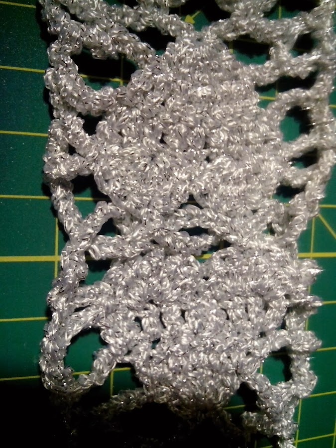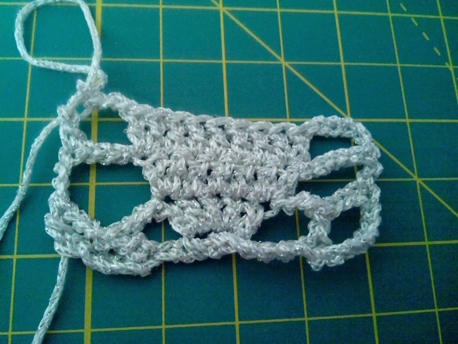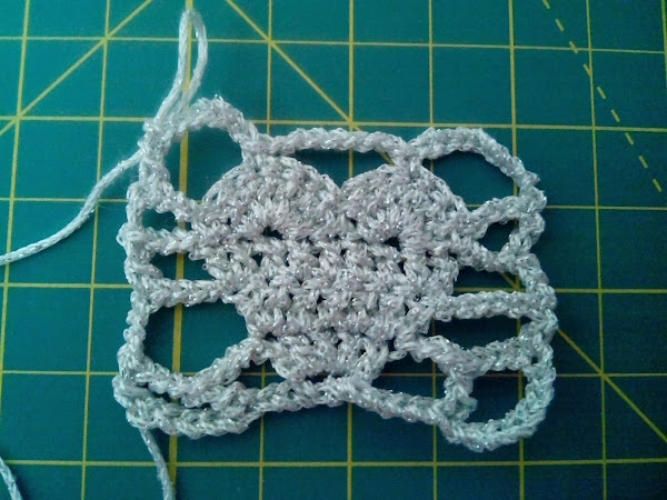 6.-Subimos 3 cadenetas y 6 cadenetas más. Hacemos punto bajo en el tercer punto alto de la vuelta anterior. 7 cadenetas y punto bajo en el tercer punto del segundo abanico. 6 cadenetas y cerramos la vuelta con un punto alto.