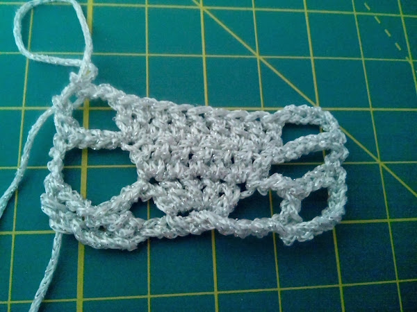 4.-Subimos 3 cadenetas más 3. Como en el paso 3.- Hacemos 2 puntos altos en el primero, luego uno por cada uno hasta el final que volvemos a hacer 2 en uno (nos quedamos con 9 puntos altos). 3 cadenetas y terminamos la vuelta con un punto alto.