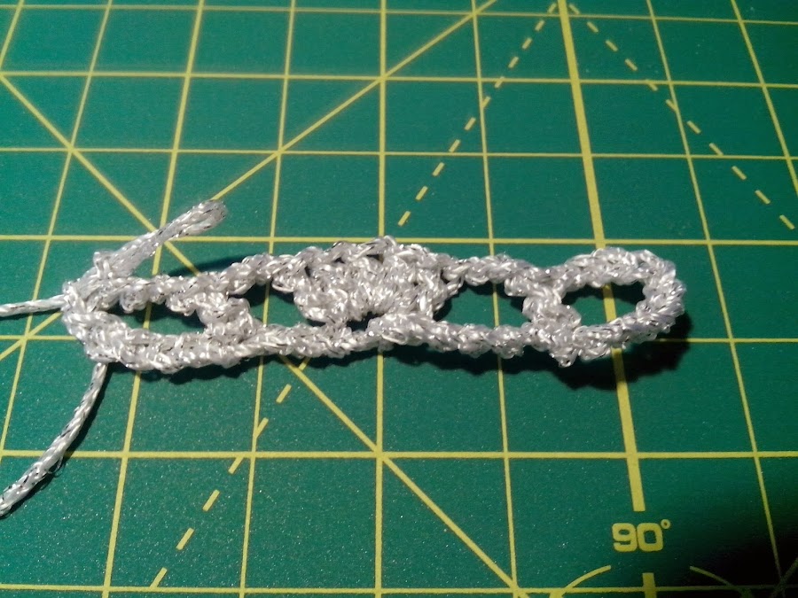 2.-Subimos tres más que será lo que hace de primer punto alto y tres cadenetas más para hacer el primer agujero. Hacemos un punto alto en la décima cadeneta (contando las del hueco y las que se toman como punto alto). Tres cadenetas y 5 puntos en la cuarta cadeneta, a partir del punto alto. Tres cadenetas y punto alto dejando 3 cadenetas. Tres cadenetas y punto alto dejando otras 3 cadenetas y nos quedaría así.