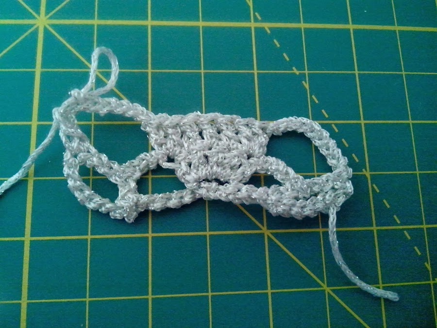 3.-Subimos 3 cadenetas y hacemos 5 más. En el primer punto alto hacemos 2 puntos altos. 3 puntos altos por cada uno de abajo y en el último volmemos a hacer 2 (nos tienen que quedar 7 puntos altos). 5 cadenetas y un punto alto.