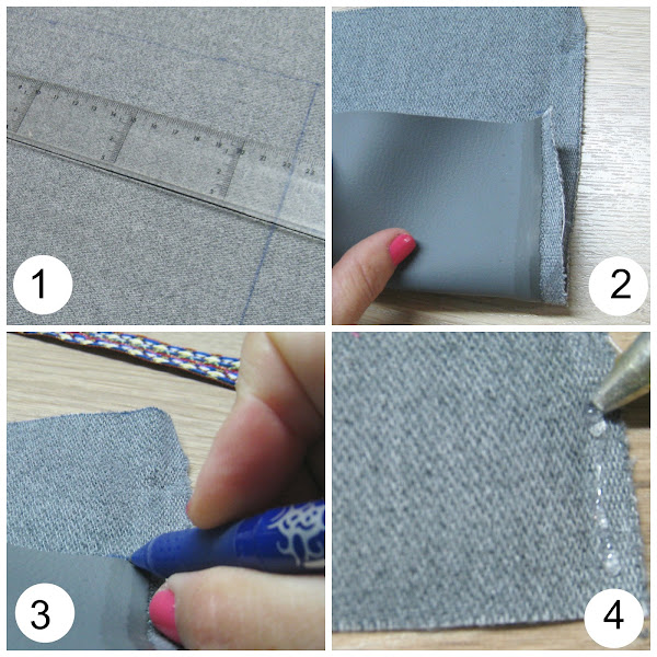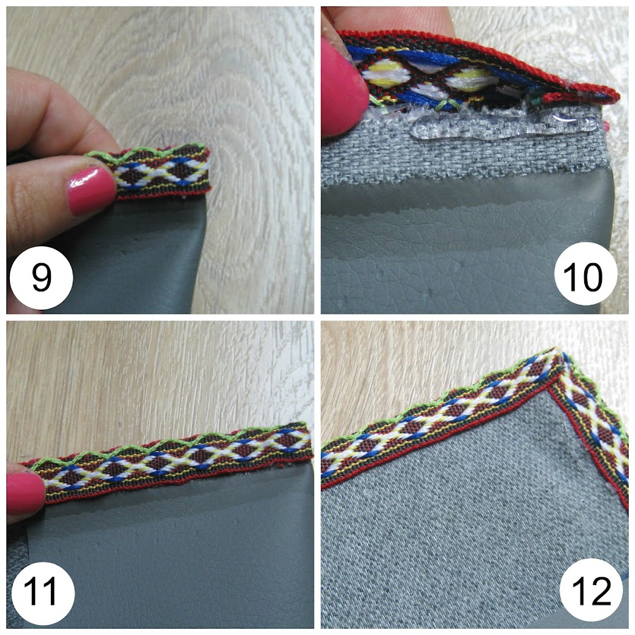Con el bolsillo listo, podemos empezar a colocar la cinta que, nos servirá de remate y de adorno al mismo tiempo. Utilizaremos cinta ancha, para así poder doblarla y colocarla por ambos lados, de esa forma no tendréis que estar pendiente de pegar por dos lados y si se sale un poco de silicona no habrá problema porque la propia cinta lo tapará. Vamos echando la silicona y colocando la cinta por todo el borde, poniendo especial cuidado al llegar a las esquinas para asegurarnos de que nos queden bien dobladas. Una vez que tenemos colocada la cinta por una de las caras, repetimos la misma operación por el otro lado.