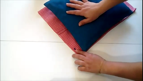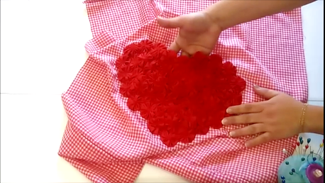 Ahora, extendemos la tela de la funda con el derecho hacia arriba y envolvemos el cojín para marcar el sitio donde colocaremos el corazón