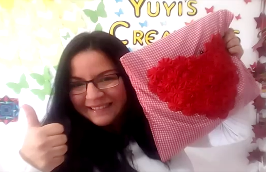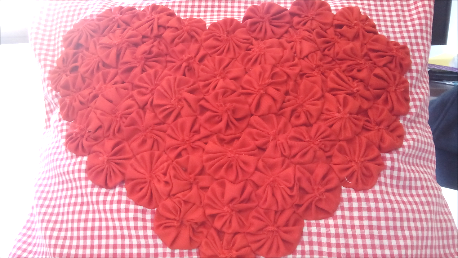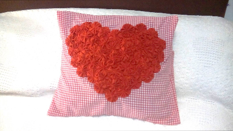 Repetiremos la misma operación con cada uno de círculos de tela. Cuando ya tengamos todas las flores listas, es momento de armar nuestra figura; en mi caso el corazón. Simplemente vamos uniendo con una puntada escondida cada una de las flores hasta darle la forma deseada. Puedes hacer sólo el contorno, o rellenarlo todo como hice yo.