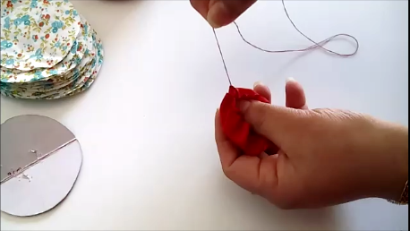 Una vez hayamos cosido alrededor, tiramos del hilo con suavidad hasta cerrarlo por completo.