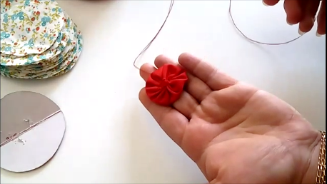 Vamos empezar por hacer las flores. Para ello sacamos un patrón circular en cartulina o cartón de 7 cm de diámetro. Cortamos entonces tantos círculos de tela como necesite la figura que quieras hacer, en mi caso, para hacer el corazón, utilicé 52 círculos de tela roja.