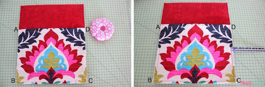 ? Cosemos una puntada recta y un margen de costura de 1/2" (1,3 cm) desde A hasta D, pasando por B y C.