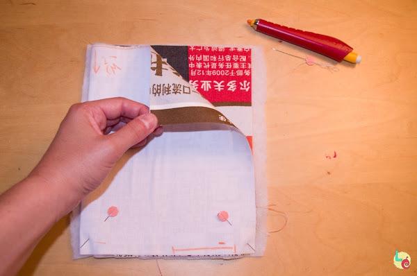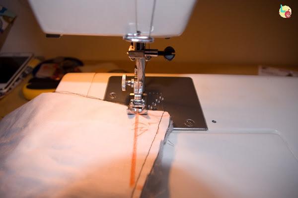 Doblamos la tela por la mitad, encarando los partes vistas, la cogemos con alfileres a la boata y cosemos por la linea de puntos.