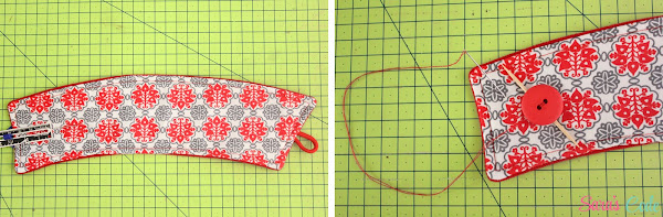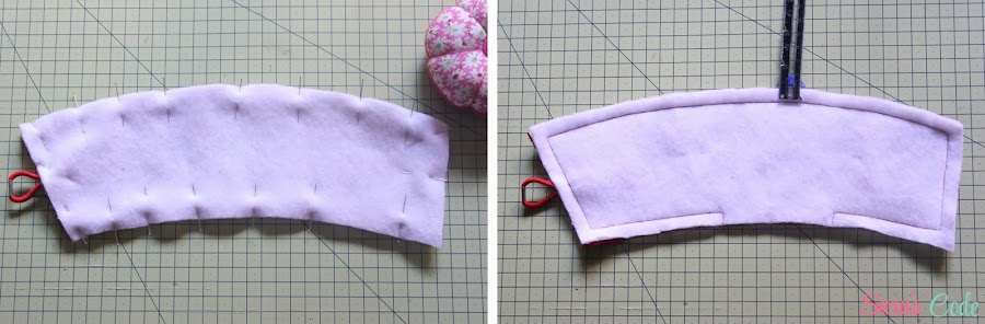 ? Sujetamos con un alfiler la goma de pelo a uno de los lados más pequeños del forro.