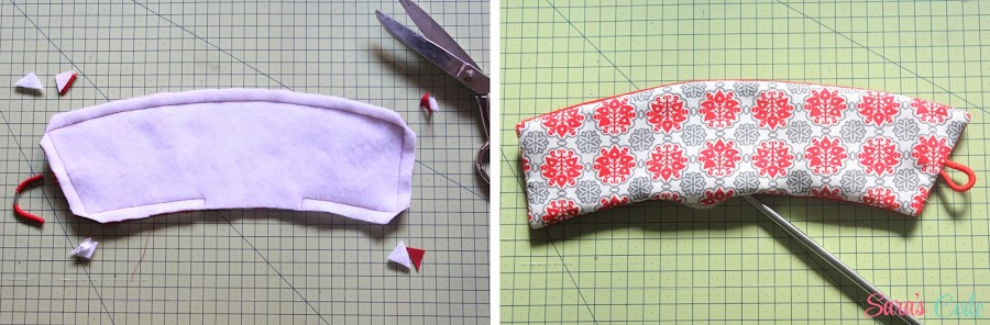 ? Con un margen de costura de 3/8 de pulgada (1 cm), cosemos una puntada recta alrededor de la funda dejando un hueco de unas 3 pulgadas (8 cm) en la parte inferior. Cuando lleguemos a la goma de pelo, rematamos un par de veces.
