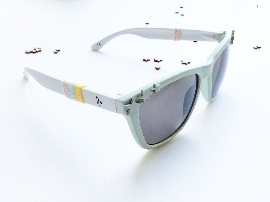 Como os he dicho, lo que hace falta para realizar este diy es: unas gafas de sol, pintura en spray, unos apliques como estas estrellitas de madera, pegamento ceys y un poco de hilo lanero.