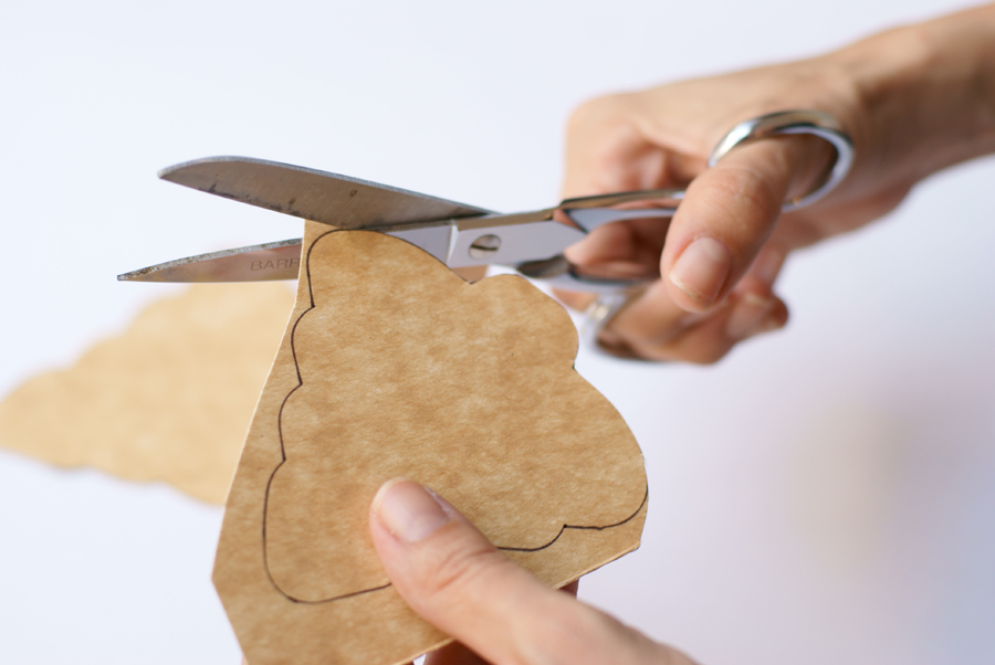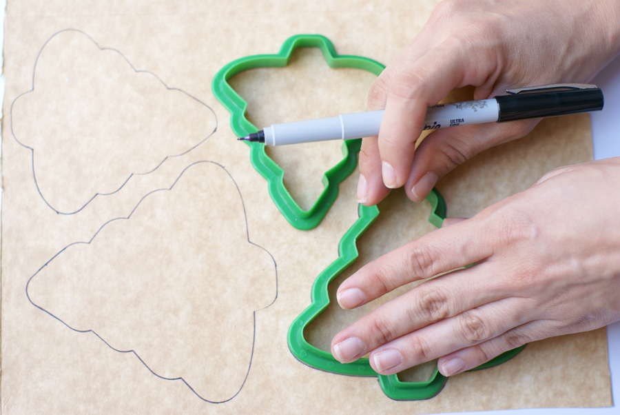 El primer paso es usar los cortadores de galleta como molde para dibujar las siluetas de los pinos en el cartón.