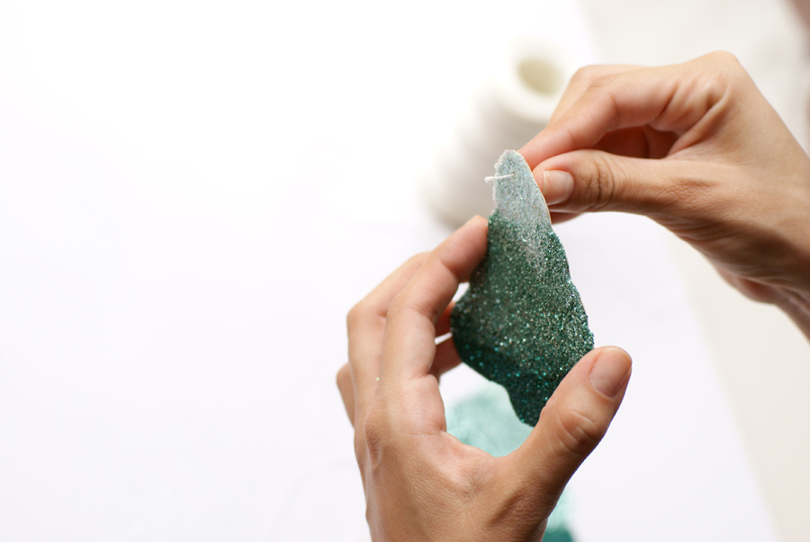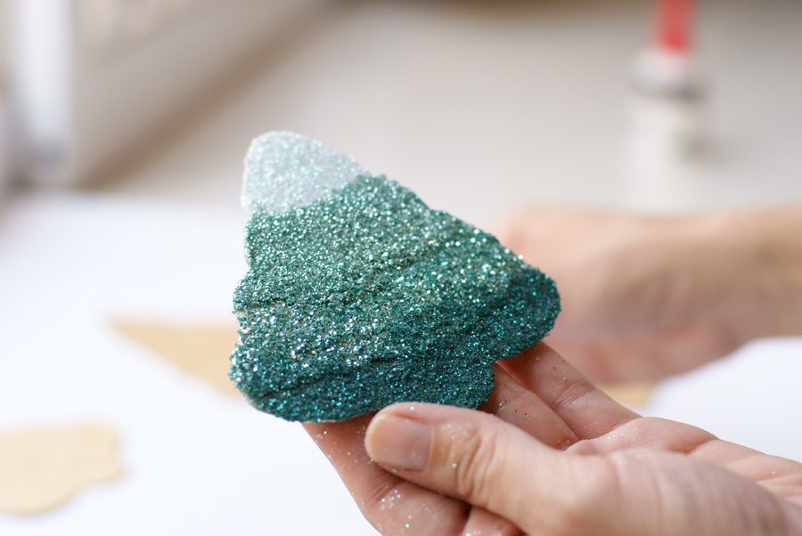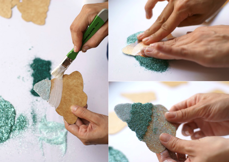 A cada uno de los pinos se le aplica el pegamento por zonas utilizando la brocha y se coloca sobre cada uno de los colores de la diamantina (yo hice montoncitos con cada uno de los colores y sobre ellos presionaba el pinito para que la diamantina quedara bien adherida), empecé con el color más claro en la punta y fui subiendo de tono hasta colocar el más obscuro en la base y así cubrir toda la superficie.