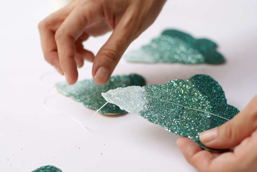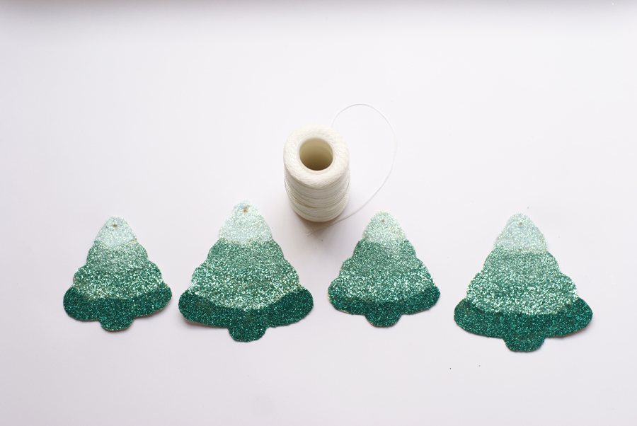 Una vez que están decorados todos los pinos solo resta hacerles un orificio en la parte superior para pasar el cordón con el que se van a colgar y listo.