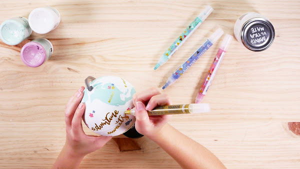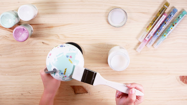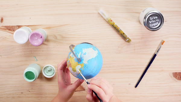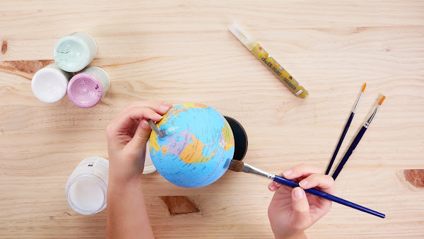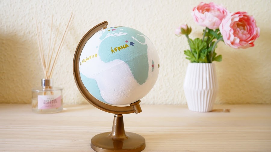 Os cuento muy rápido el paso a paso porque os dejo el vídeo al final del post para que podáis verlo con detenimiento: primero aplica una base de barniz para que la pintura se fije bien a la bola. Luego pinta los continentes de un color y el agua de otro (utiliza un pincel más fino para los bordes y otro más grueso para rellenar). Escribe alguna frase bonita con efecto lettering (recuerda, primero escribe normal y luego regruesa las verticales) y también puedes utilizar los rotuladores para nombrar los continentes y los océanos. Decórala a tu gusto (yo, por ejemplo, he hecho florecitas de colores repartidas por el globo) y por último desmonta la base y píntala a juego con tu diseño.