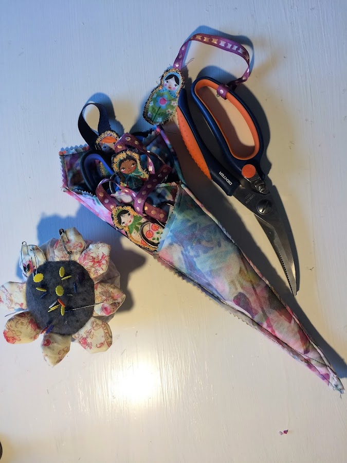 Como veis, tengo varias tijeras, de distintos tamaños y para cortar cosas distintas, tengo las pequeñas, las de papel, las de tela, las de zig-zag, las que pueden con todo.... Pero me gusta cuidarlas y tenerlas siempre juntas, así cuando me pongo a hacer alguna cosa, saco mi guarda-tijeras y tengo todas a mano, porque normalmente utilizo más de una.