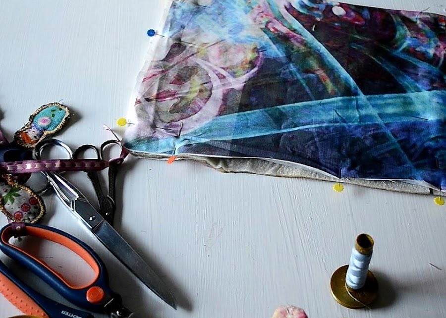 - Ponemos la tela revés contra revés, doblada por la mitad y dentro el rectángulo del estabilizador. Sujetamos con alfileres y lo pasamos a la maquina. Un pespunte todo el perímetro del rectángulo.