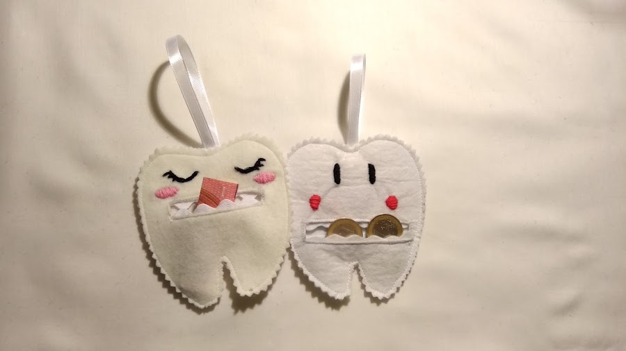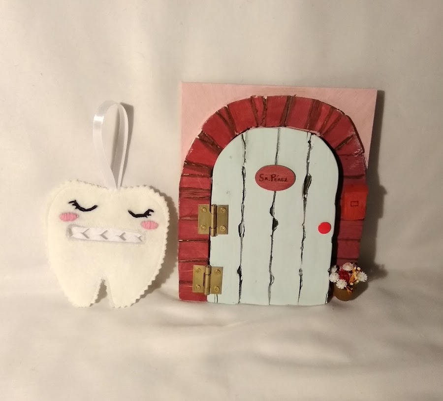 Este guardadientes es un estuche con forma de diente con una apertura en la boca , los ojos están bordados y tiene un lazo en la parte superior para colgar. Es ideal para que el Ratoncito Pérez te deje su recompensa a cambio del diente.