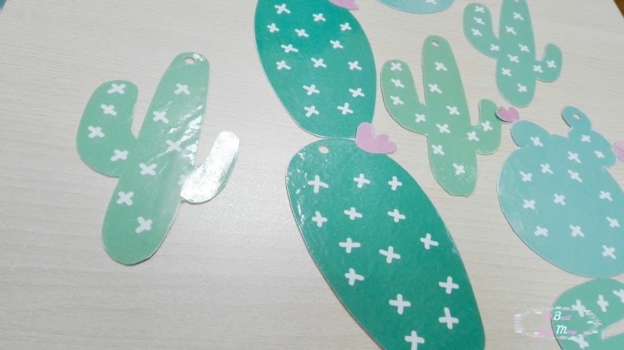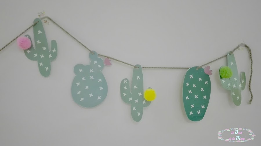 Yo os cuento mis truquillos para que quede más consistente. La imprimí en papel normal, la pegué sobre cartulina verde (así el reverso también es verde aunque no el mismo) y la plastifiqué. De este modo conseguimos una guirnalda a prueba de manos inquietas ;) Para darle un poco más de color y un toque personal, le he colocado unos pompones de colores a los cactus más finitos.