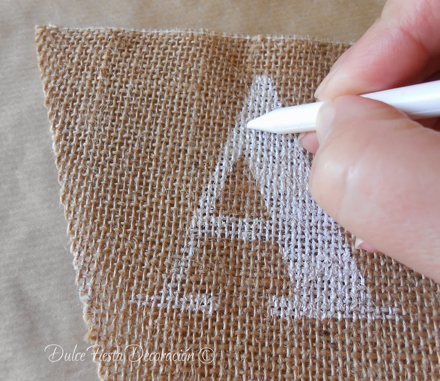 Colocamos la plantilla encima de la tela de arpillera y cortamos por el contorno.