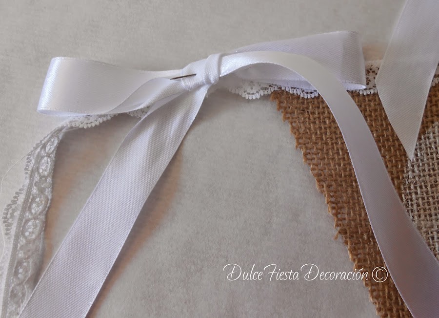 La tela de arpillera o yute es una tela gruesa y áspera con una maravillosa textura que puede ser utilizada en múltiples decoraciones para tu boda o celebración. Y combinada con encaje o blonda blanca le da un aire vintage maravilloso.