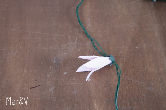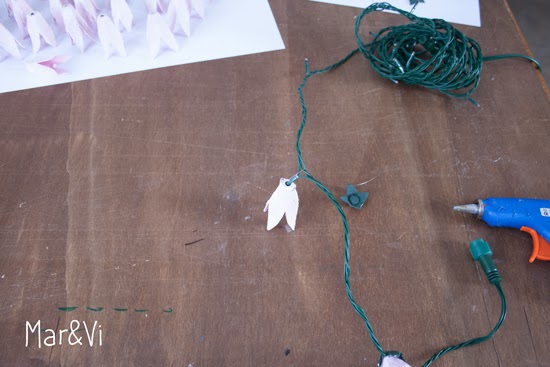Cuando las piezas estarán bien secas, podemos comenzar a montar nuestra guirnalda de luces con flores de cartón. Mi cartón de huevo ya tenía agujeritos en la punta de los conos, pero si el vuestro no los tiene tendréis que hacerlos para pasar por allí las lucesitas.